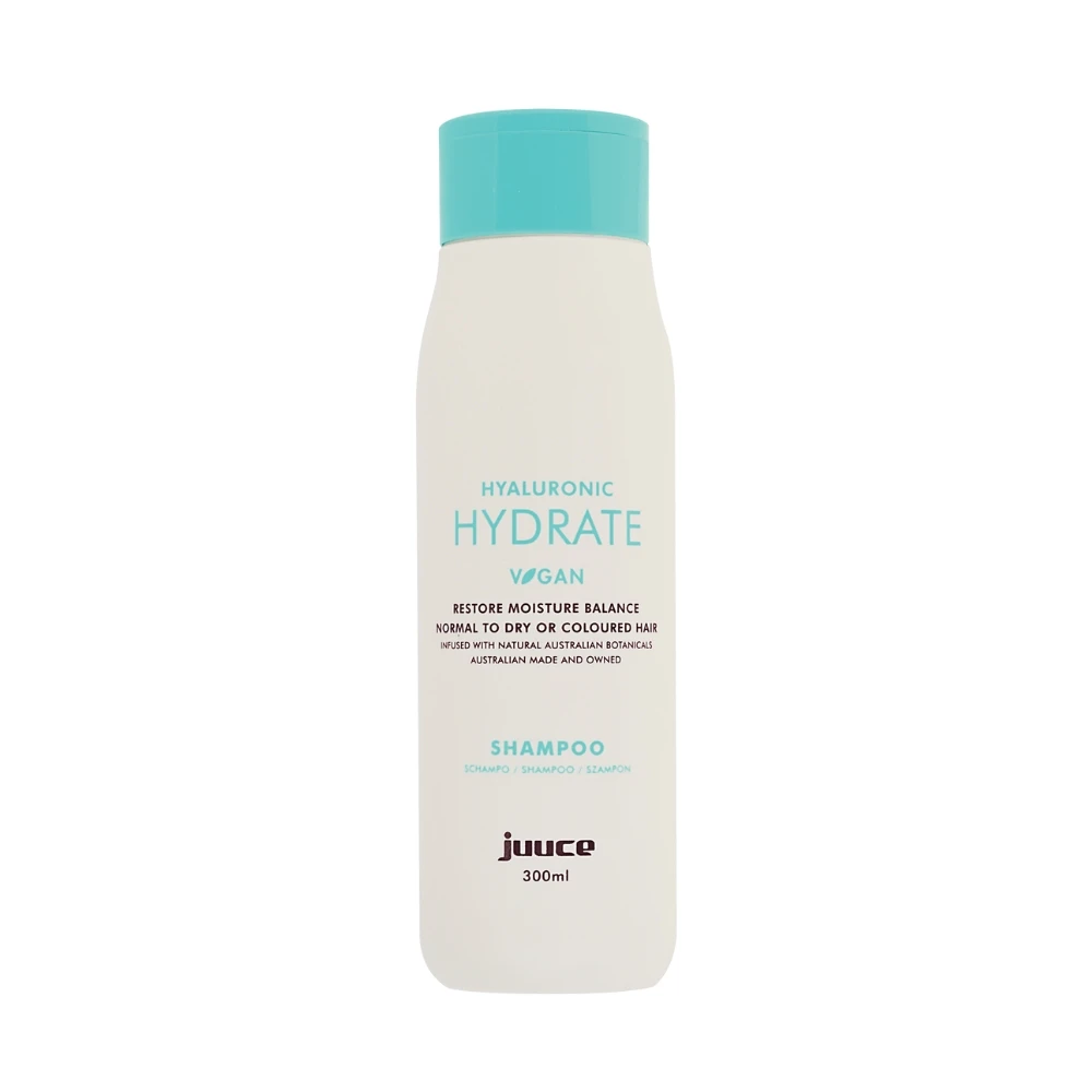 JUUCE HYALURONIC HYDRATE SHAMPOO shines & hydrates dry/chemically treated hair. Key Actives: Hyaluronic Acid, Hydrolyzed Rice Protein and Aloe Vera rejuvenates normal to dry or coloured hair.