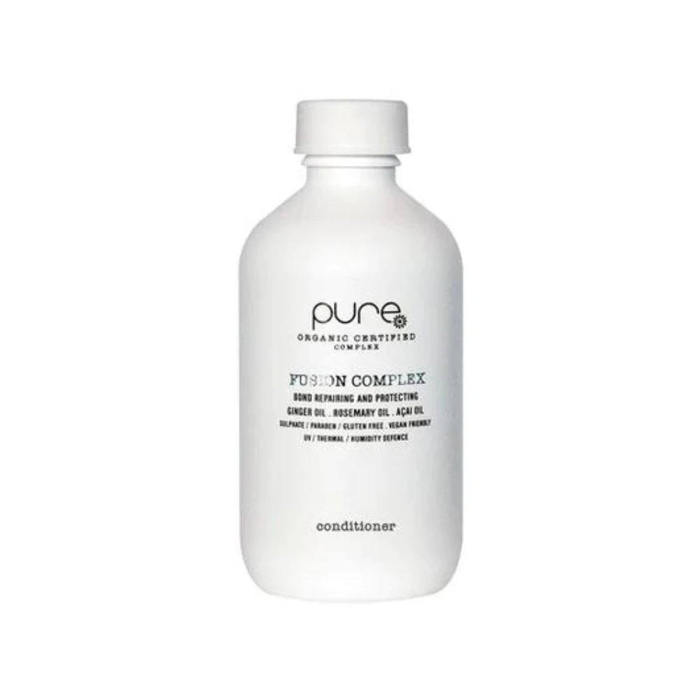 PURE Fusion Complex Conditioner. This is a beautiful blend of science with nature. ‘Bond Cure’ plus organic complex blend together to create a luxurious restructuring shampoo and conditioner Organic Ginger Oil, Rosemary Oil and Açai Oil has amazing antioxidant benefits to soothe and repair damaged hair. Protects hair against UV, thermal and humidity. Repairs split ends to d-frizz, smooth and make hair more manageable.
